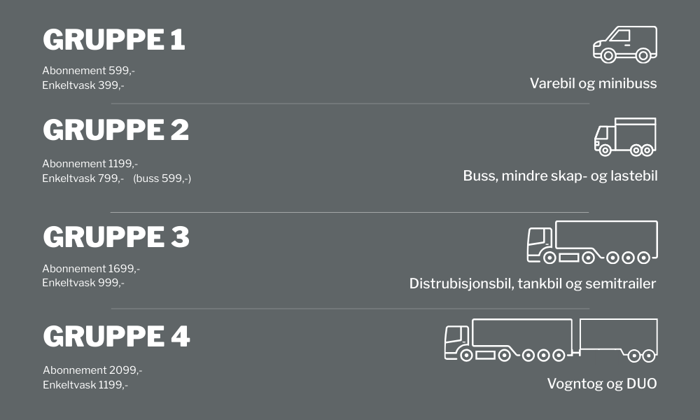 Få storbilvasken inn i regnskapet. Fyll inn skjemaet og send inn. Vi tar kontakt og avtaler hvilket program dere ønsker til de ulike kjøretøyene. Vi hjelper til med opplæring av sjåfører om nødvendig. Spørsmål? Ta kontakt 24/7!